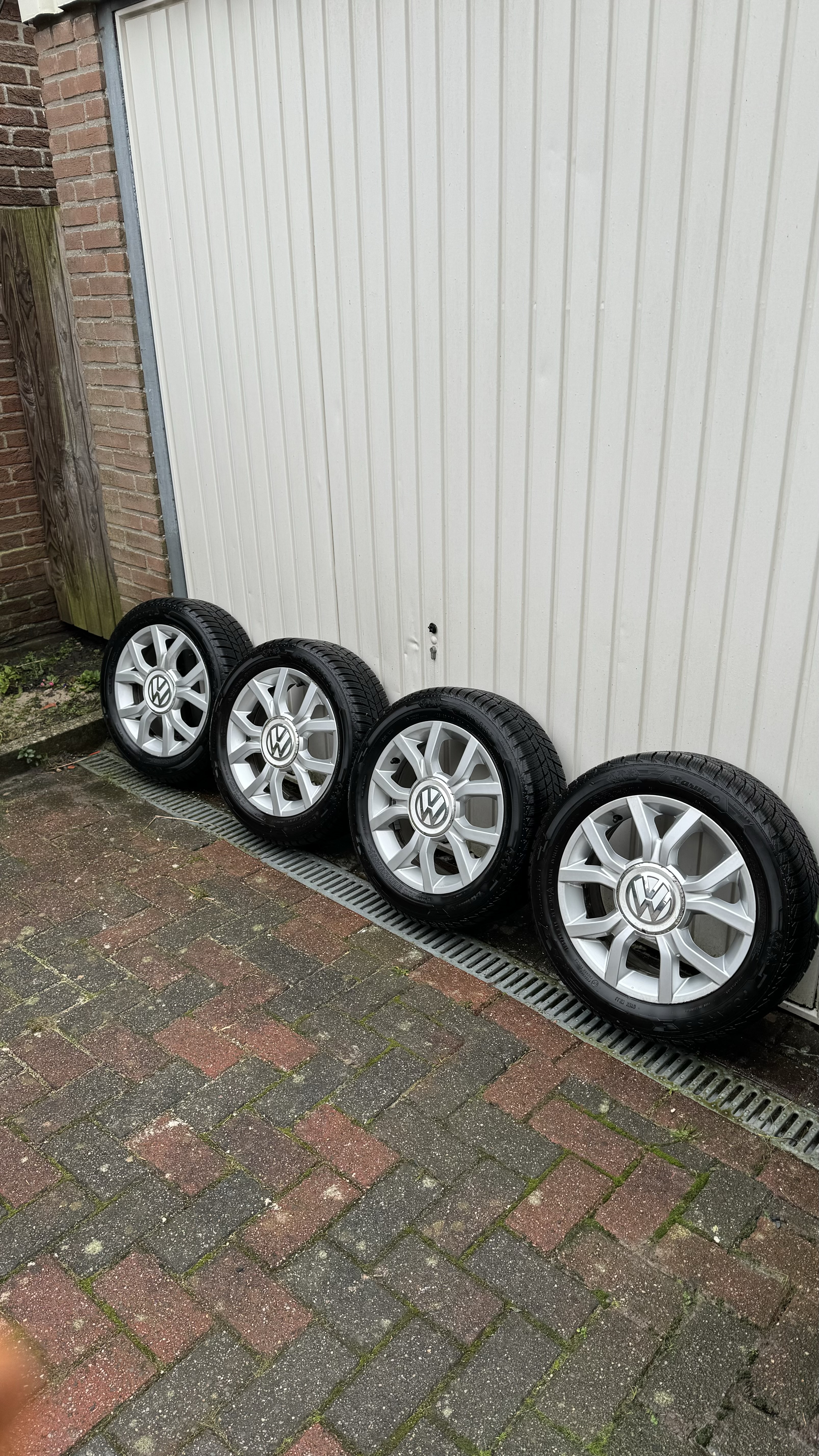 15 inch originele Volkswagen ‘Waffle’ velgen met goede winterbanden (7mm profiel). Velgen in goede staat. Een velg met lichte stoeprandschade. Exacte bandenmaat te zien op de foto’s.